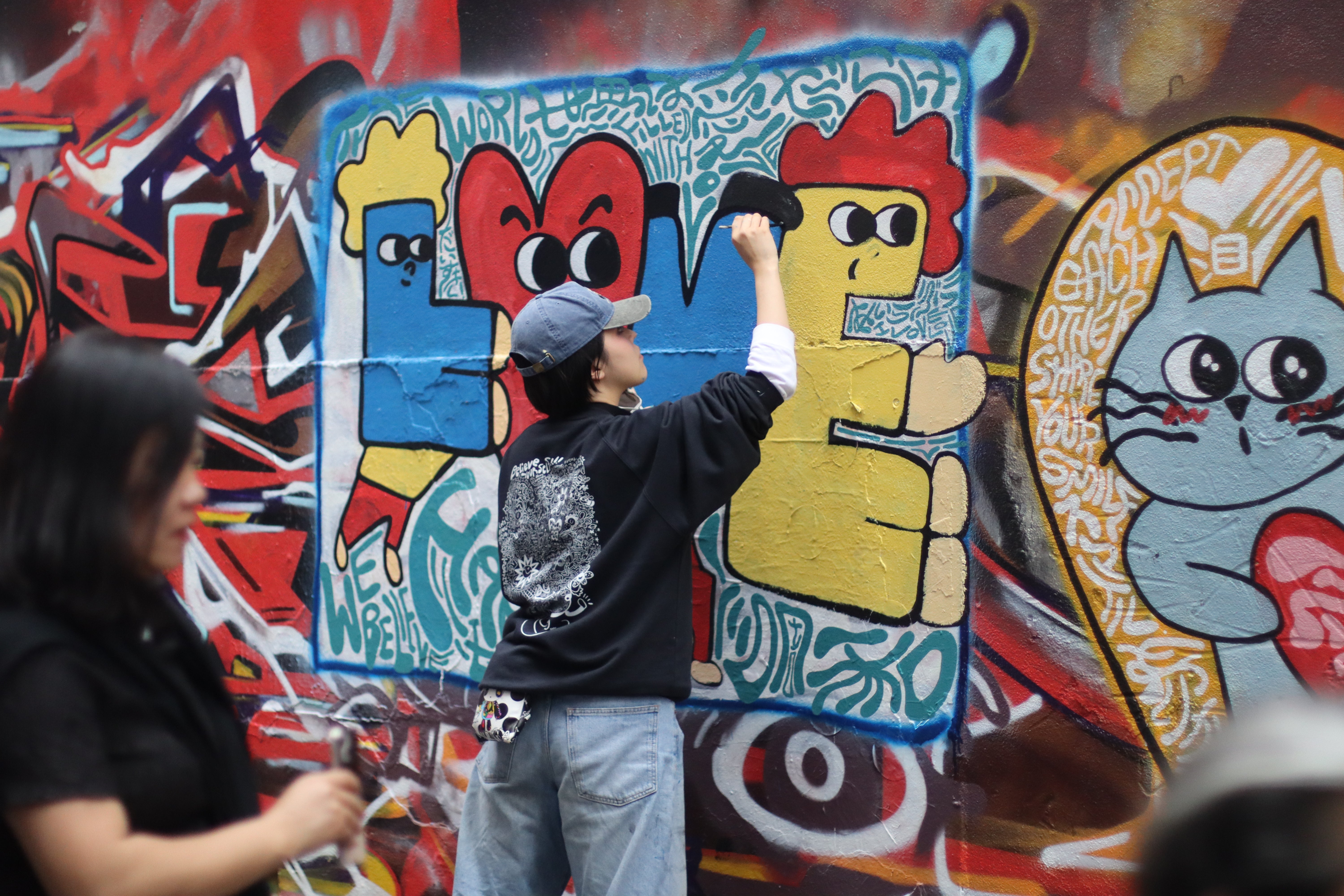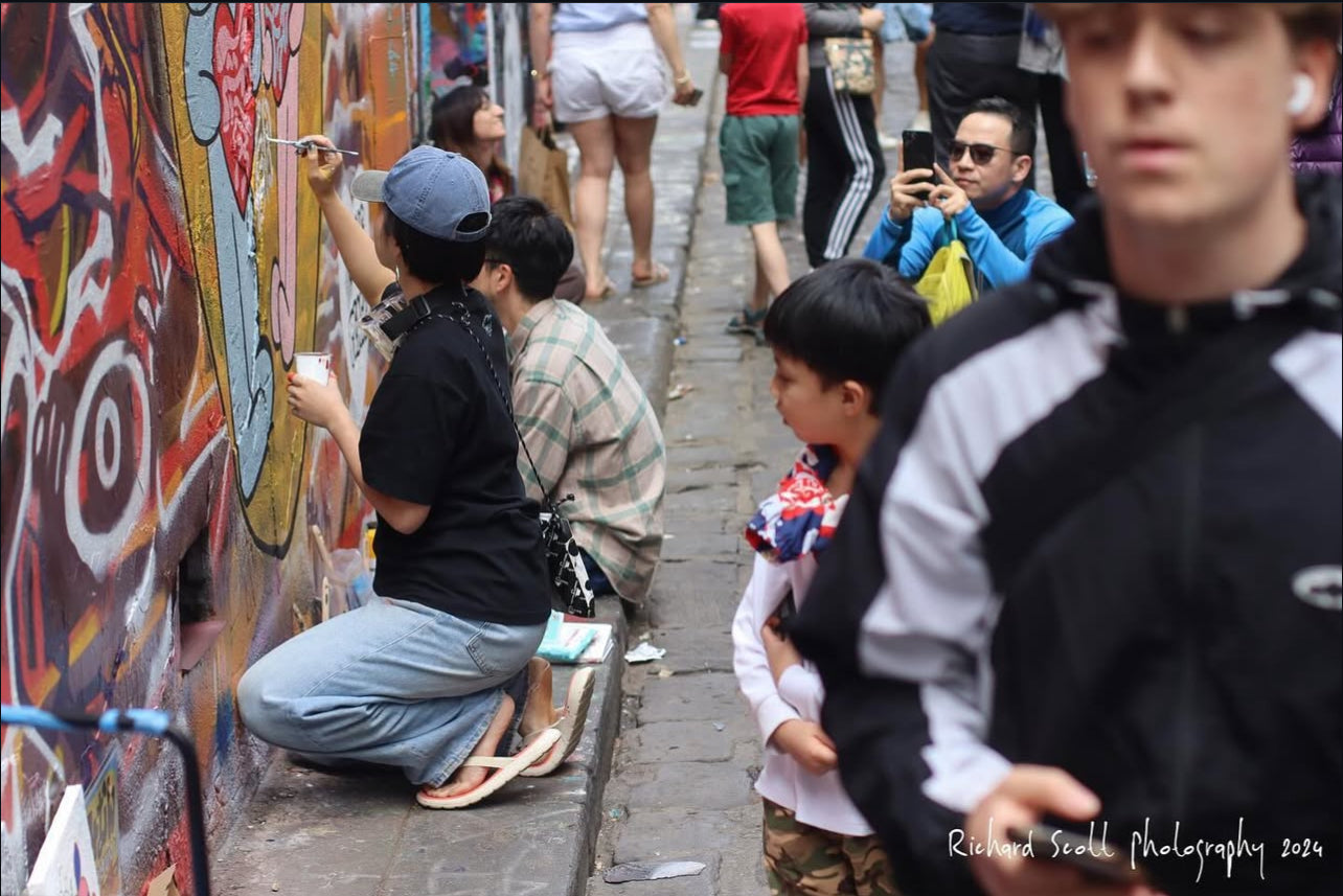 This mural began with the theme “LOVE YOURSELF.” On the final day, a huge LOVE suddenly came down from the sky...I just had to paint it! It felt like a gift from the spirit of Hosier Lane, carried on the good vibes of Melbourne.