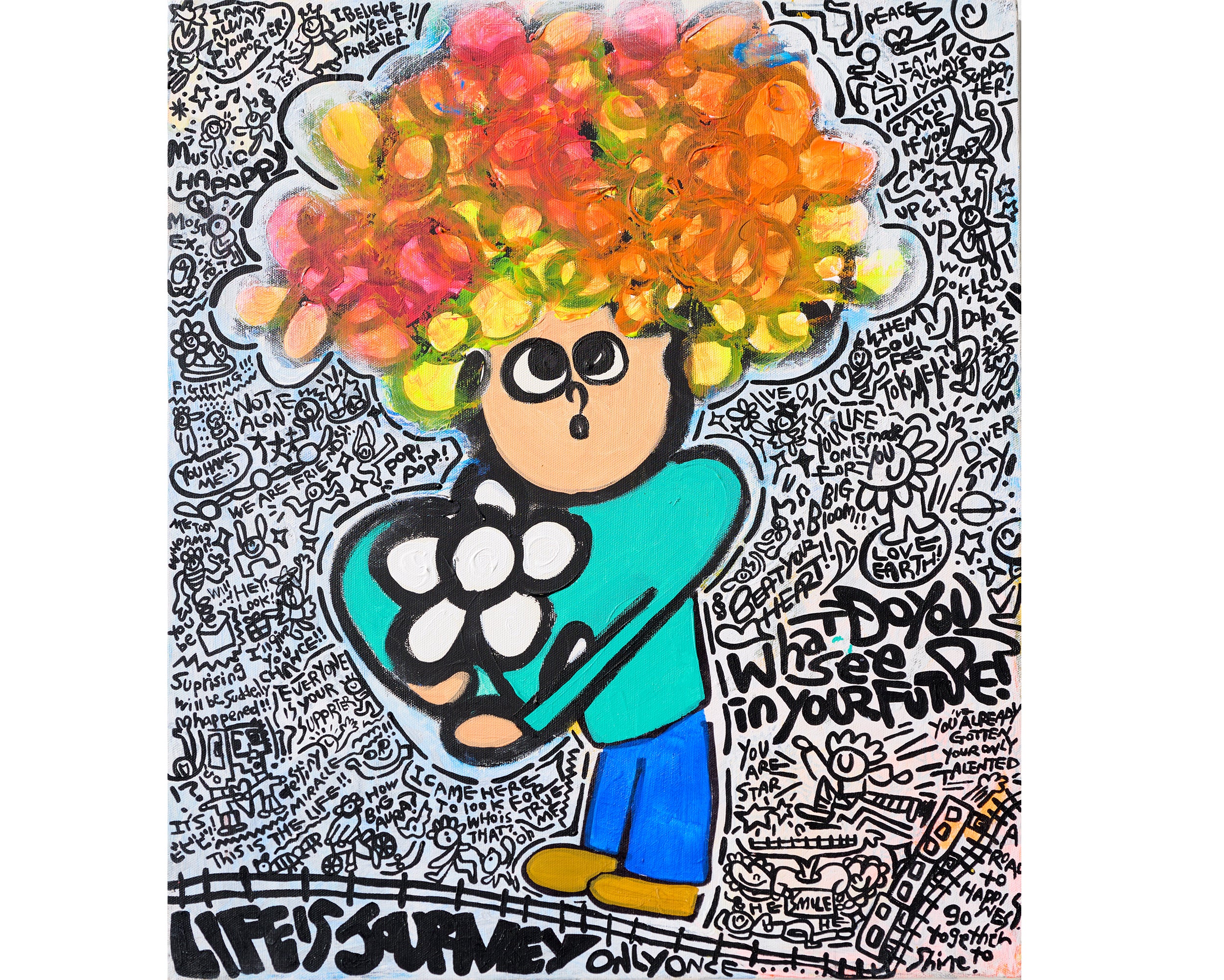 So lift your head, ride the happy vibes, and laugh as your heart dances free!400×500mm including frame, Acryl & pen on canvas, 2025