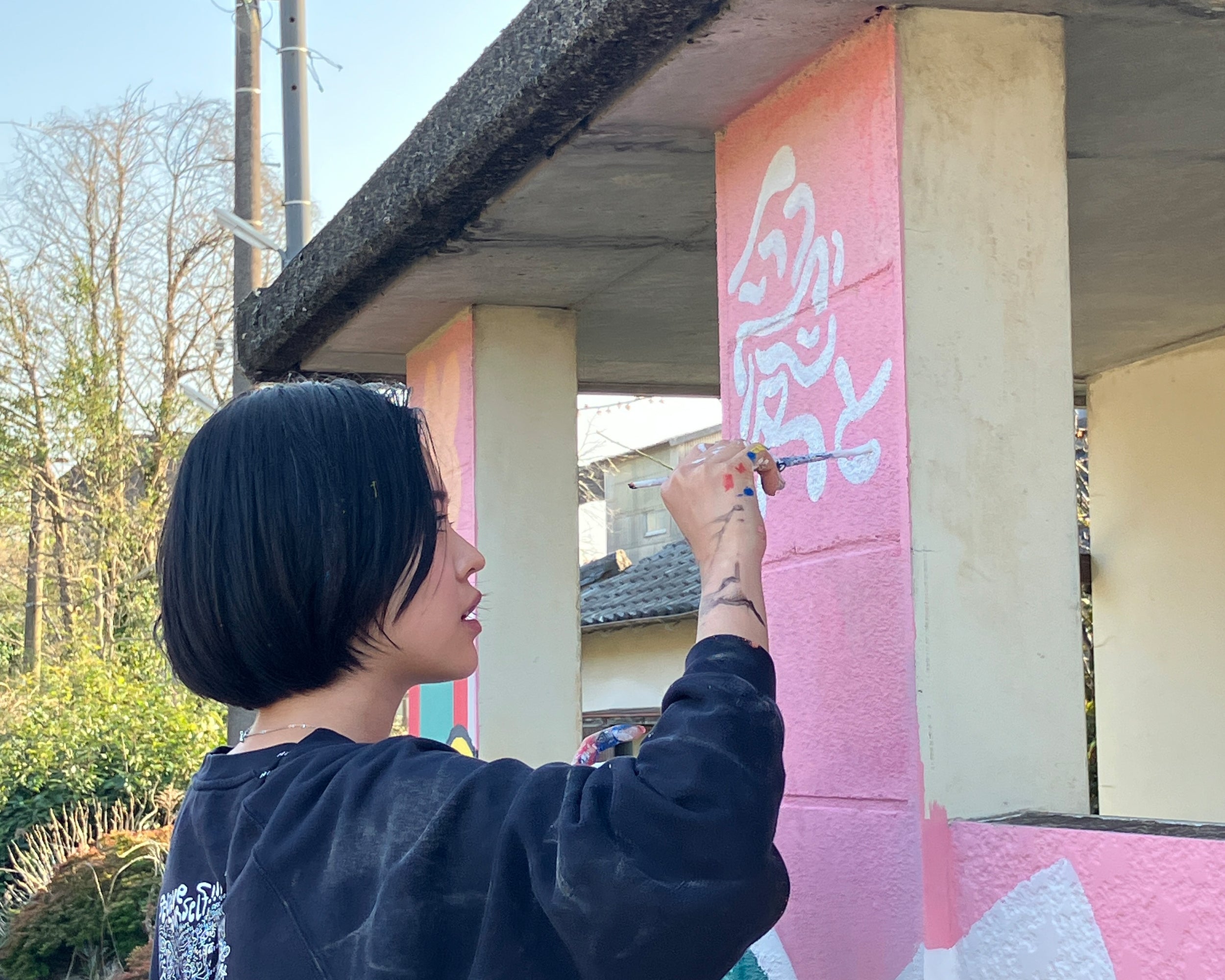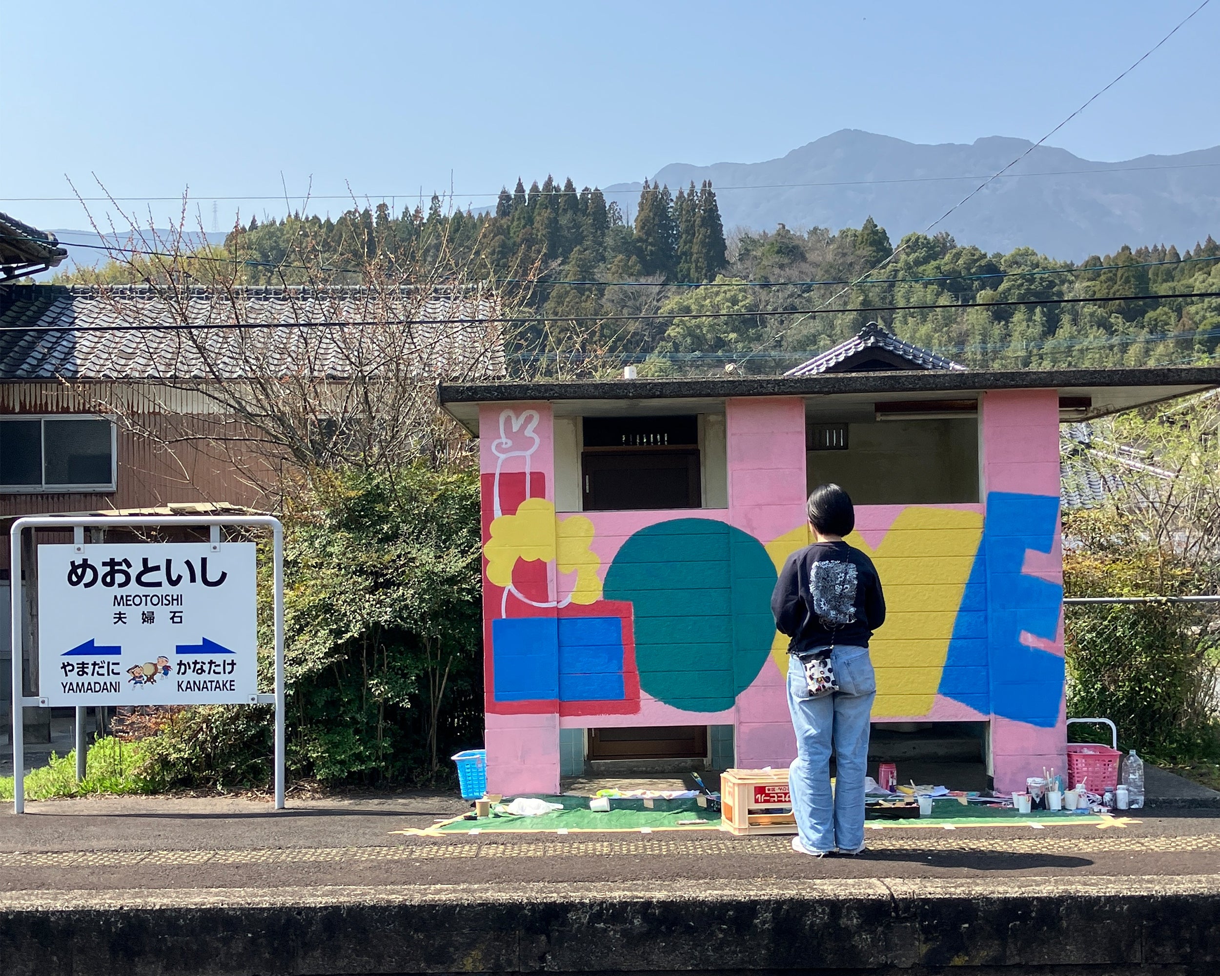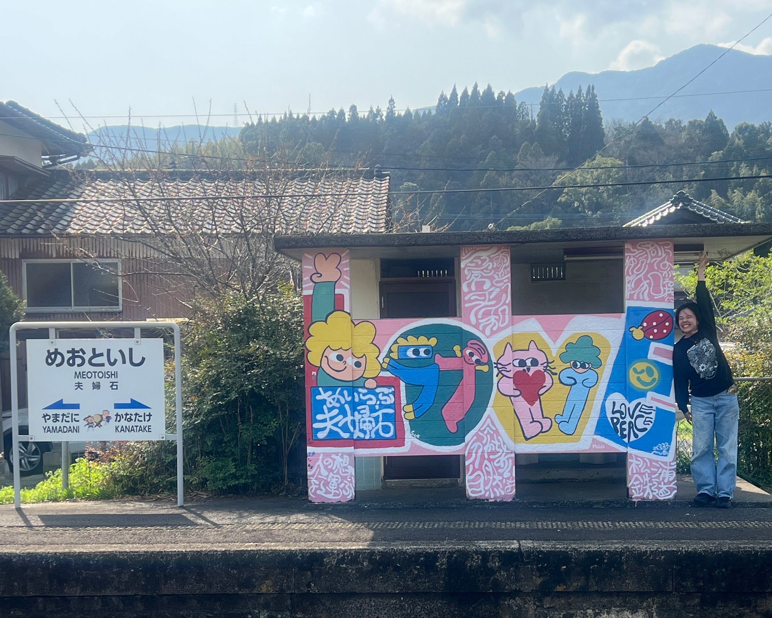 The fourth mural for Matsuura Railway was created at Meotoishi Station, in collaboration with the railway staff, the Arita Tourism Association, the town hall, and local families. The time we spent painting side by side was filled with love, and every brushstroke became a cherished memory. This is the first piece in Japan shaped from the “LOVE” I received
