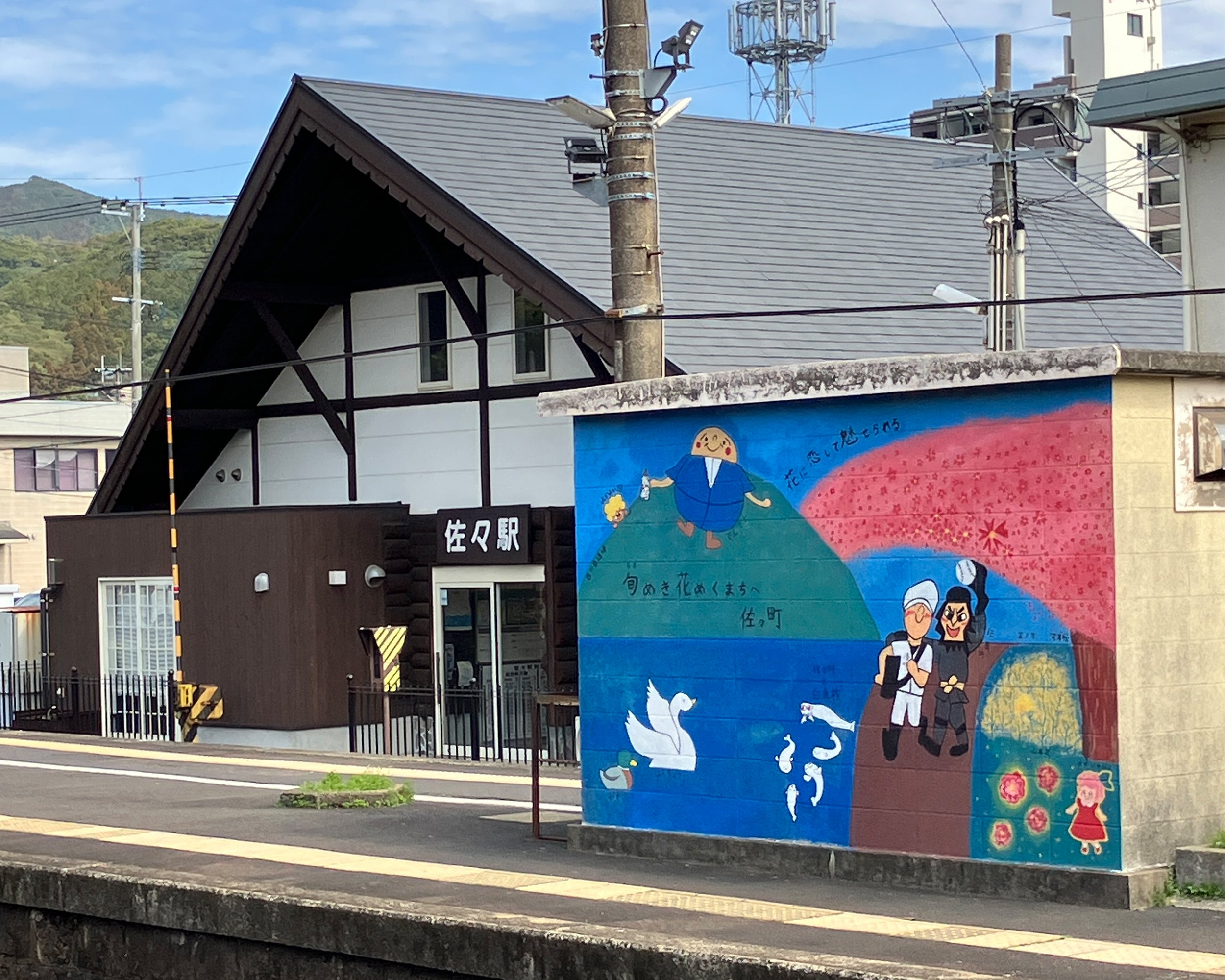 A collaborative mural with four young artists from a local high school, as part of a mural art project with Matsuura Railway. Each of them expressed the charm of Saza Town through their own unique style.